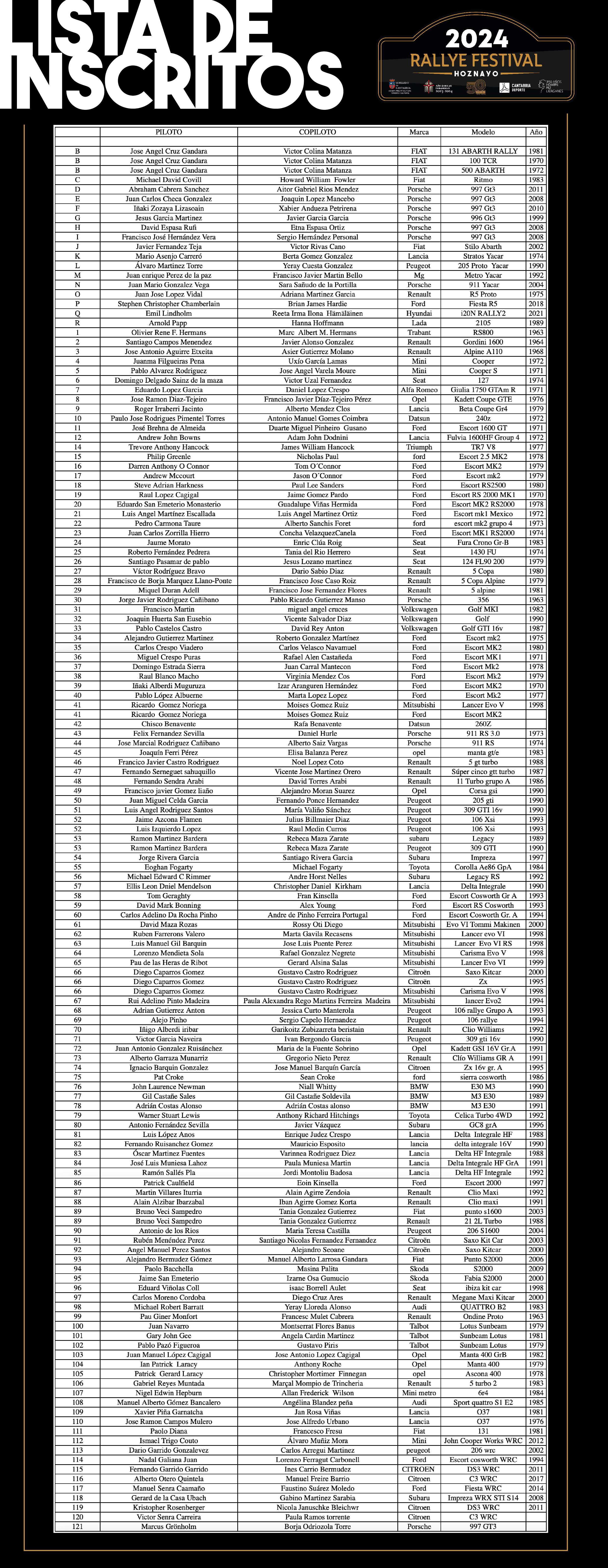 Opublikowana lista zgłoszeń zawiera ponad 120 pozycji. Zgodnie z zapowiedziami na trasie Festivalu pokaże się Marcus Gronholm. Fin wsiądzie do Porsche 997 GT3. Pilotem dwukrotnego mistrza świata będzie Borja Odriozola.